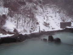 湯は灰色がかった乳白色の湯。適温とぬるめの2つに仕切られています。川沿いにあり、雪を見ながらの湯はとても気持ちよかったです。
