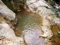 湯船の上の岩壁から間欠的に湯がザーザーと流れ落ちてきます。この湯の元をたどったら、脱衣場の少し上流にあるポンプ小屋で汲み上げた湯が流れてくるようになっていました。ロケーションは素晴らしいが残念ながら全て人工の湯のようです。 |