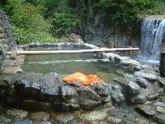 谷に降りると透明度の高い川が右手に流れています。川岸はうまく整備されていて、150mほど歩くと滝と露天風呂にたどり着きます。 |